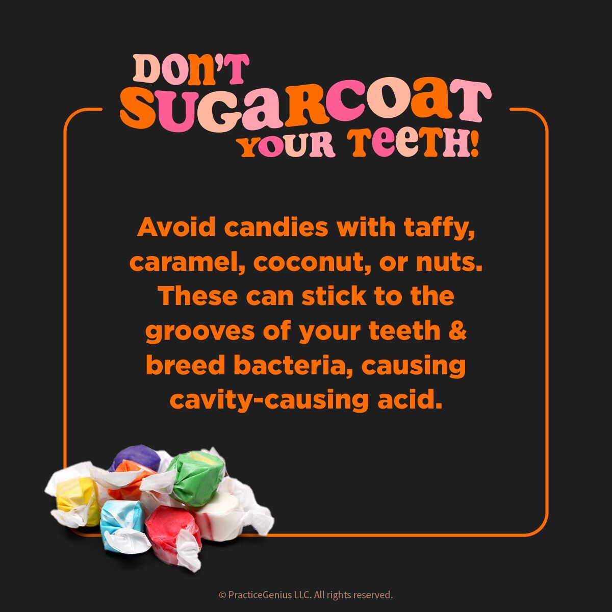 Avoid candies with taffy, caramel, coconut, or nuts. These can stick to the grooves of your teeth & breed bacteria, causing cavity-causing acid. #Sugarcoated